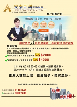 物業貸款 凡本公司現有客戶推薦親友/朋友申請物業貸款,一經批核及成功提取貸款,推薦人可獲現金獎賞。