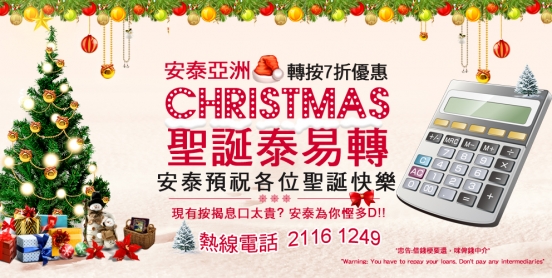 安泰預祝各位聖誕節快樂!!!! 現有息口太貴? 安泰為你慳多D 安泰聖誕禮物大優惠 ---- 按揭轉按 7折優惠,按揭轉按 7折優惠送比你...新客戶轉按即享最低 7 折減息優惠!!!! 熱線電話 2116 1249 網上申請: www.axht.hk *安泰亞洲對是次活動保留最終決定權及受條款及細則約束*